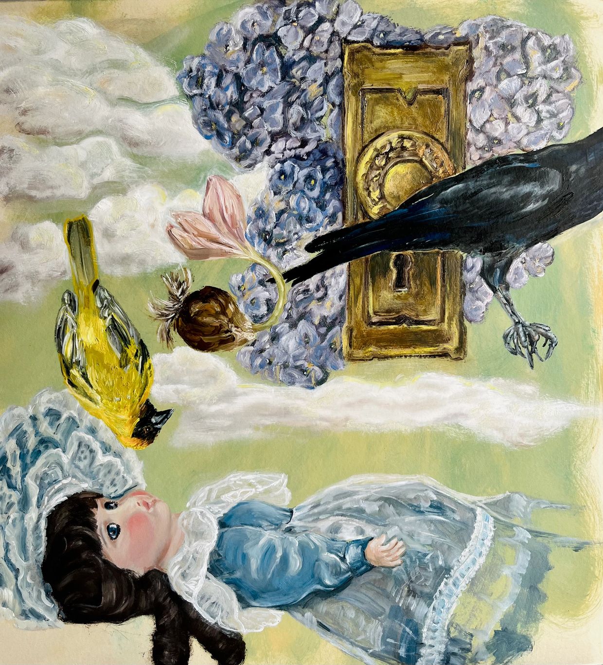 Among clouds and yellow 'sky', a porcelain doll lies suspended, her gaze fixed upward—or inward—into a dream world. Above her, a constellation of symbolic forms: an upside-down golden finch, a dark crow, blooms and an ornate door knob. As an ex-psychotherapist, the artist’s enduring fascination with childhood is not nostalgic but investigative. The painting’s composition operates less as a narrative than as a pattern of symbols and aesthetic elements on the picture plane, in equilibrium, bound together not by logic but by associations.