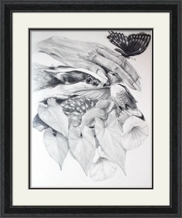 Things fragile, fleeting and instinctive: hands, wings, leaves. They overlap and blur...caught mid-movement, mutual edges...a shared extistence. The hand of care and control, birds and butterflies for freedom, the patterned coats of woodland creatures to disguise and dissolve animals into plants.