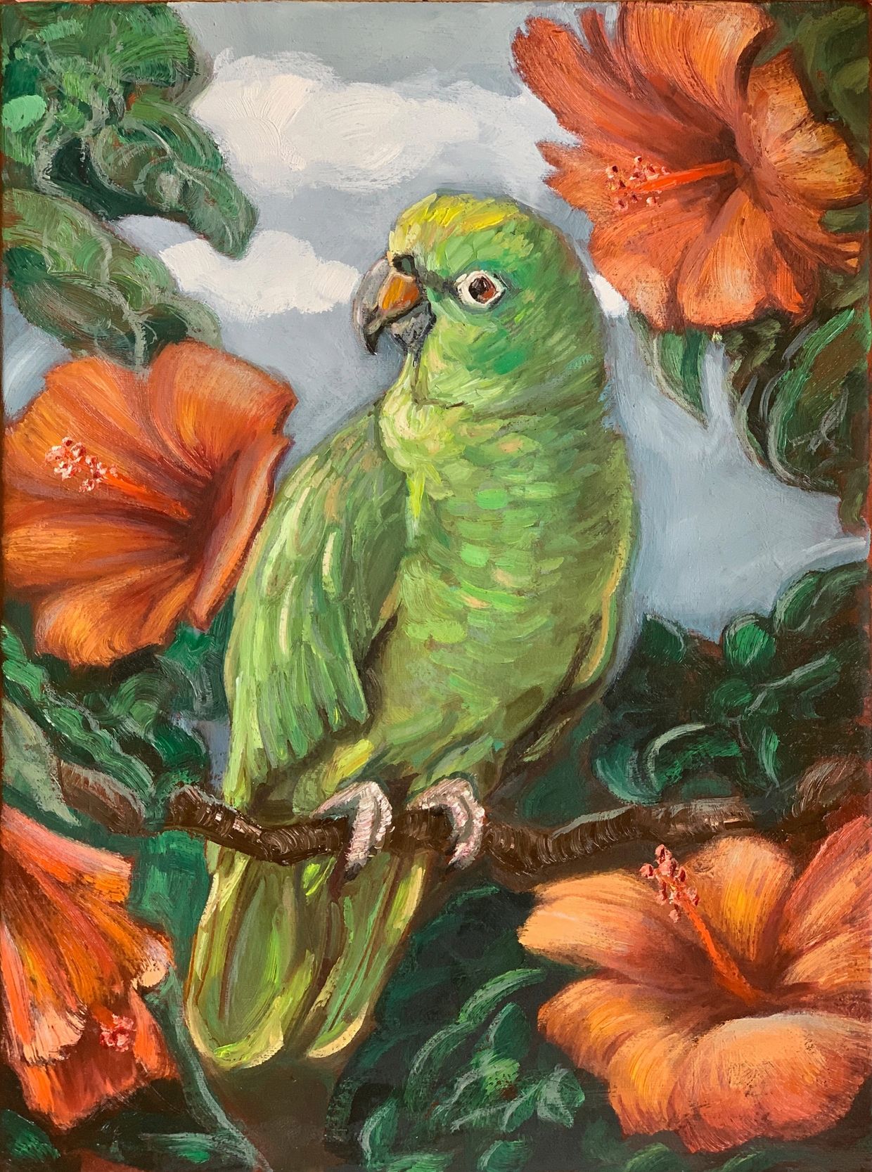 This painting depicts a green parrot surrounded by hibiscus flowers against a backdrop of sky and clouds. The parrot is shown perched on a branch, its feathers rendered in shifting shades of green to emphasize depth, light, and movement. The surrounding hibiscus blooms, painted in warm reds and oranges, create a strong contrast with the parrot’s cooler tones and highlight the vibrancy of the natural setting.