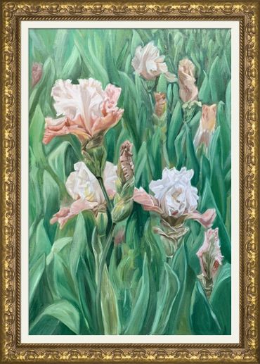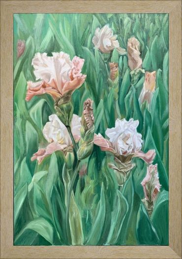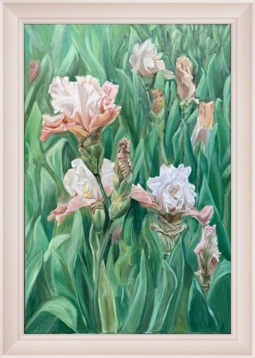 I’ve always been drawn to irises, especially in this particular soft blend of pinks and whites. Their frilled, sculptural blooms have a stateliness that can easily feel static when painted. To counter that, I structured the composition around a diagonal movement, giving the image more dynamism and vitality. This diagonal creates a sense of flow across what is otherwise a still, contemplative subject.
