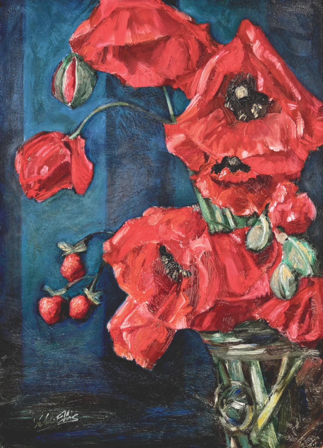 The bold contrast between the saturated reds of the poppies and the deep, cool blues of the background creates a heightened visual impact. The background’s striped pattern introduces rhythm and structure, enriching the interplay between foreground and backdrop. This tension between organic forms and patterned setting underscores the expressive potential of color and composition.