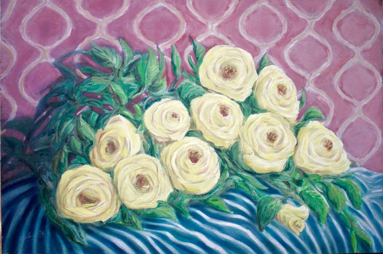 This painting of yellow roses is part of my ongoing series of flowers. The initial inspiration came from a few images of yellow roses that struck me with their warmth and luminosity. Roses, of course, carry endless associations of beauty, delicacy and sentimentality—but I wanted to take them beyond being just a straightforward botanical subject.